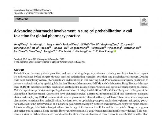 关于药师利用MTM模式开展外科预康复的呼吁在《国际临床药学杂志》(IJCP)发表