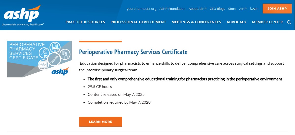 美国卫生系统药师协会(American Society of Health-System Pharmacists)也于2025年5月7日启动了该协会第一个外科药学培训项目——围手术期药学服务证书(Perioperative Pharmacy Services Certificate)项目(https://www.ashp.org/professional-development/professional-certificates?loginreturnUrl=SSOCheckOnly)。