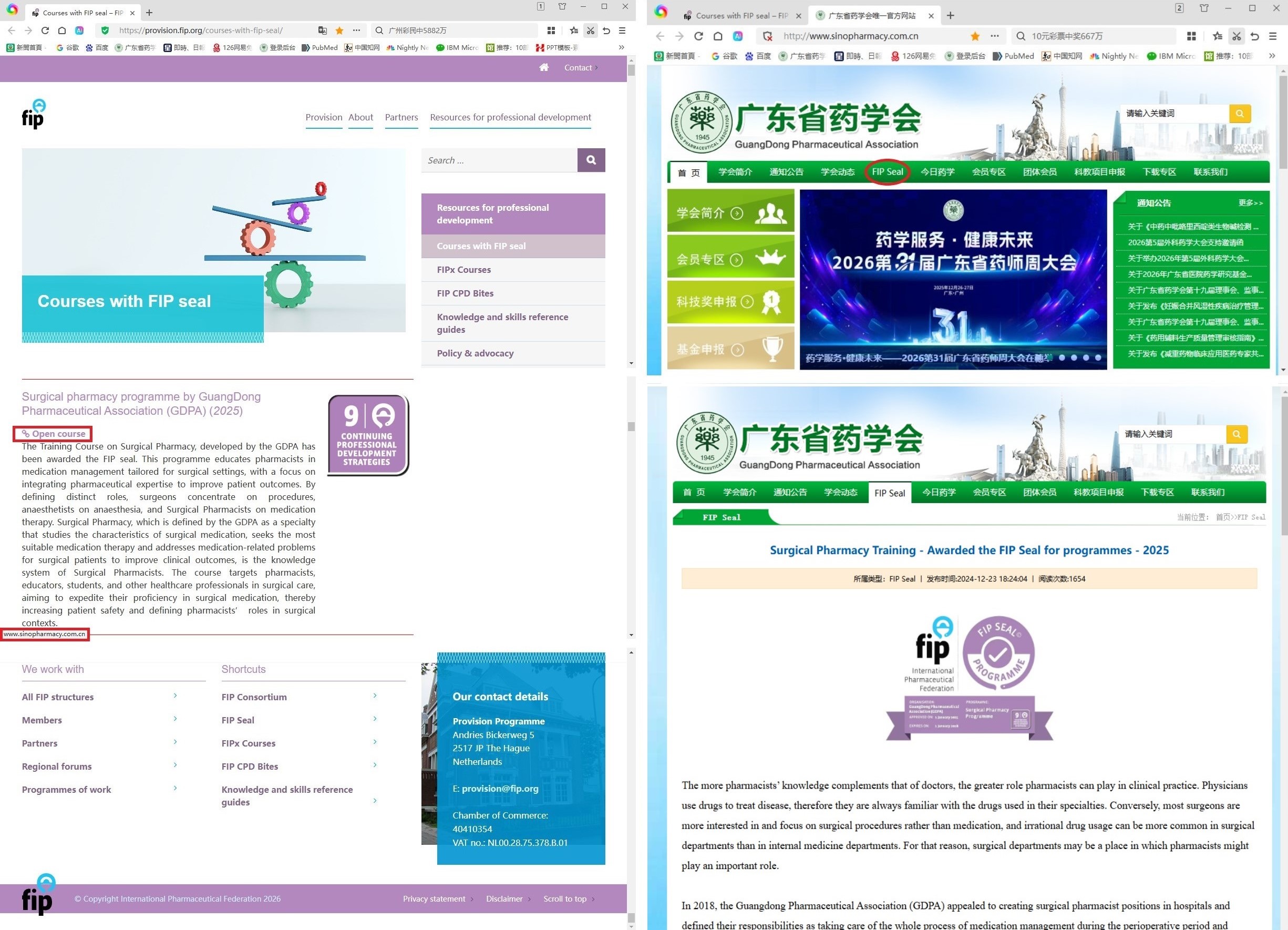 广东省药学会(以下简称“本会”)2015 年率先提出“外科药师”概念;2020年开展第一次外科药师培训,并构建外科药师的知识体系——外科药学(Surgical Pharmacy);2021 年 6 月在 BMJ 系列《欧洲医院药学杂志》(European Journal of Hospital Pharmacy)发表外科药学专题论文(https://ejhp.bmj.com/content/30/1/e2.long),首次向国际学界推介中国外科药学模式;2023年1月在全球最大的药学组织——国际药学联合会(International Pharmaceutical Federation,FIP)官刊《国际药学杂志》(International Pharmacy Journal, IPJ)以“外科药学——拓展中国外科患者药学服务的新学科(Surgical pharmacy - A new specialty to expand pharmacists’ role in surgical patients’ care in China)”为题详细介绍了“外科药学”在中国产生的背景、定义、特点、意义、学科框架、发展历程和前景等内容(https://www.fip.org/publications?item=551),并鼓励世界各国在广东省药学会工作的基础上再接再厉,做好外科药学服务;同年3月,FIP在其全球网站开设了“外科药学”专栏(https://www.fip.org/pharmacy-in-china),目前共发表了本会13个外科药学专家共识,分享给全球的400多万药师、药学科研工作者和药学教育专家;2023年9月25日,本会协助FIP举办在澳大利亚布里斯班召开的第81届世界药学大会的外科药学论坛,系统介绍外科药学的知识框架、理论及实践,以FIP新当选主席Paul Sinclair为首、共30多名FIP高层领导亲临现场助阵(http://www.sinopharmacy.com.cn/activity/2891.html);2024年12月15日,外科药学获FIP颁发的“印章(Seal)”全球项目证书与授权(https://provision.fip.org/courses-with-fip-seal/),本会官网因此开设了面向全球药师的外科药学培训专栏(http://www.sinopharmacy.com.cn/fipseal/);2025年5月17日,FIP副主席Robert Moss院士、首席运营官Carola van der Hoeff 教授、医院药学专委会副主席Josep Guiu院士、中国总代表陈征宇院士和本会副理事长兼秘书长郑志华主任药师在第4届外科药学大会启动了FIP Seal外科药学项目(http://www.sinopharmacy.com.cn/activity/3326.html)。