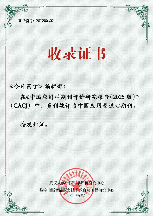 近日,由武汉大学中国科学评价研究中心、数字出版智能服务技术教育部工程研究中心联合开展的2025版应用型期刊评价工作圆满完成,《中国应用型期刊评价研究报告(2025版)》正式发布。经权威评审与严格遴选,《今日药学》成功入选“医药卫生领域”中国应用型核心期刊,继2023版后蝉联此项殊荣,标志着期刊在学术质量、行业影响力与应用服务能力等方面获得国家级评价体系的高度认可。这一荣誉,离不开各位专家学者们的贡献和学术支持,以及广大作者和读者朋友们的持续关注与鼓励。在此,由衷地向一直以来关心和支持本刊发展的各级领导、编委、专家以及广大作者和读者朋友致以最诚挚的感谢!